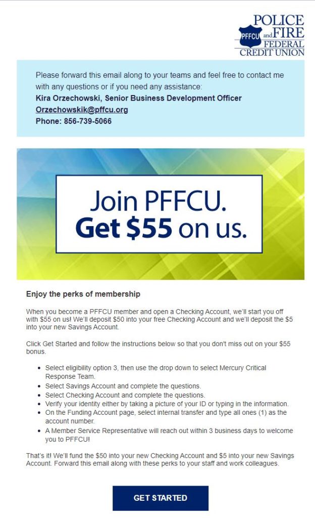 Police & Fire Fighters Credit Union As a member of the Mercury Team, you are invited to join the PFFCU. Click on the image below to visit the webpage